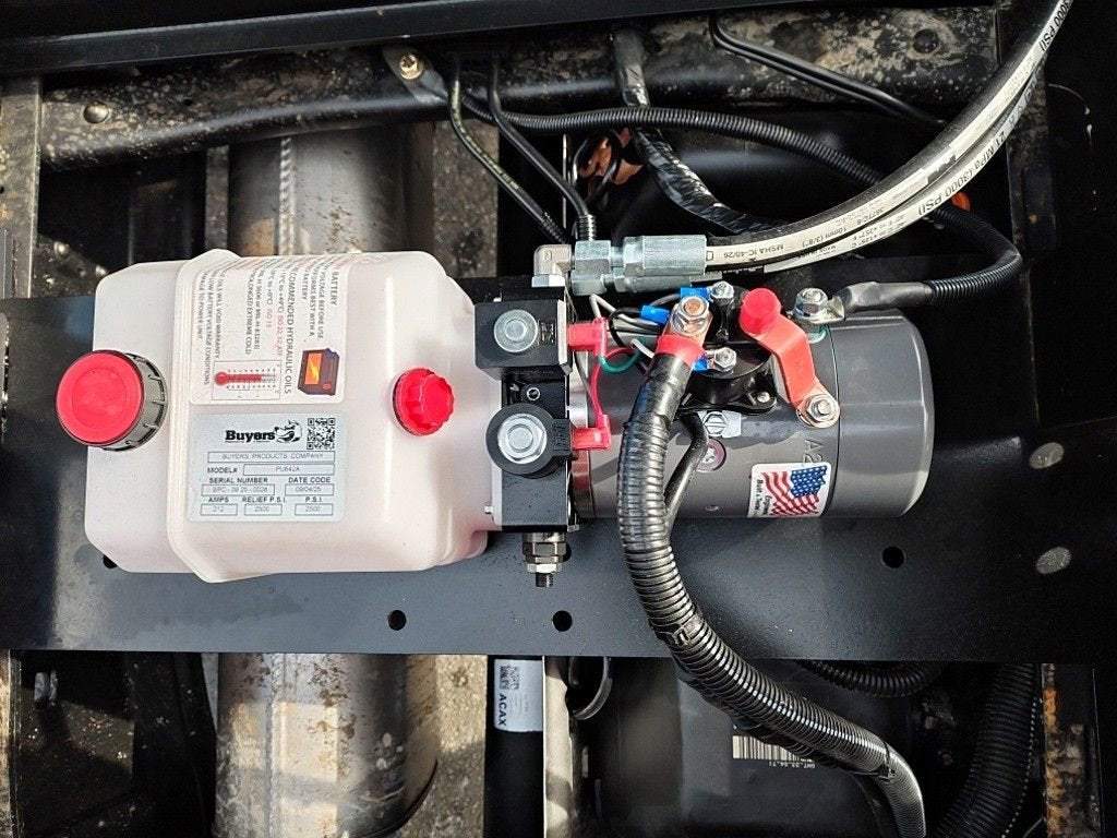 Dump Body: Mfg.; CM Dump Body, 9 Length, 18 10-gauge sides with pockets, 24 10-gauge two-point tailgate, 3/16 heavy-duty steel flooring, 3 structural channel crossmembers, Champion Scissor and Hoist, 12V Hyd. Power, Hitch Plate, Tarp Roller Kit 7.5x18, Splash Guard-Aluminum, Mudflaps.